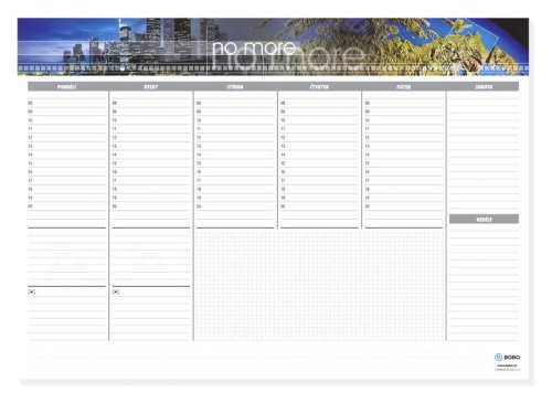 Papierová podložka skvele poslúži ako pomocník na pracovnom stole. Nemá dáta, iba označené dni v týždni. br brPapierová podložka na pracovný stôl s týždenným kalendáriom, kde ale nie sú uvedené dáta. br br Nájdete tu iba označenie dní v týždni, a tak si môžete zapisovať plány bez obmedzenia a bez ohľadu na to, aký je práve týždeň. Podložka ponúka aj dostatok miesta pre poznámky a kontakty. br brPlánovacia podložka bezdátumová, A2 br• Formát: A2 br• Počet listov: 30 br• Papier: 80 g br• Väzba: lepená br• Kalendárium: týždenné, bezdátumové