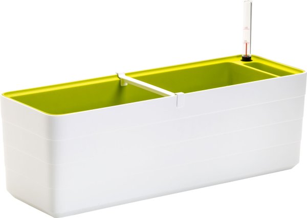 Plastový samozavlažovací kvetináč s kontrastným vnútorným dielom s úchytmi pre ľahkú manipuláciu. Súčasťou je: hladinomer, svorky, knôty, dostatočne veľký zalievací/prepadový otvor. Šírka: 60 cm, výška: 20 cm, hĺbka: 20 cm.