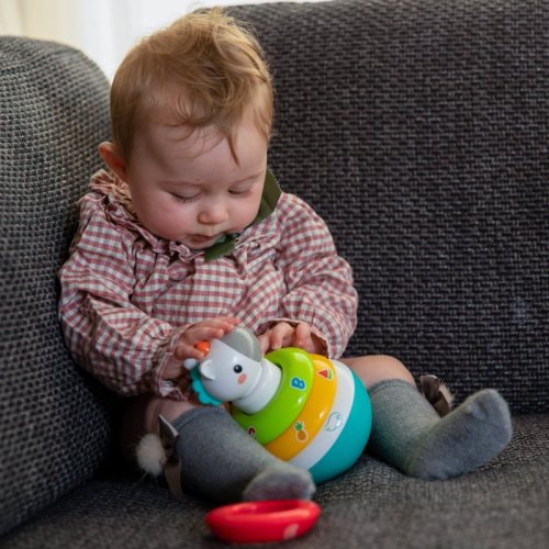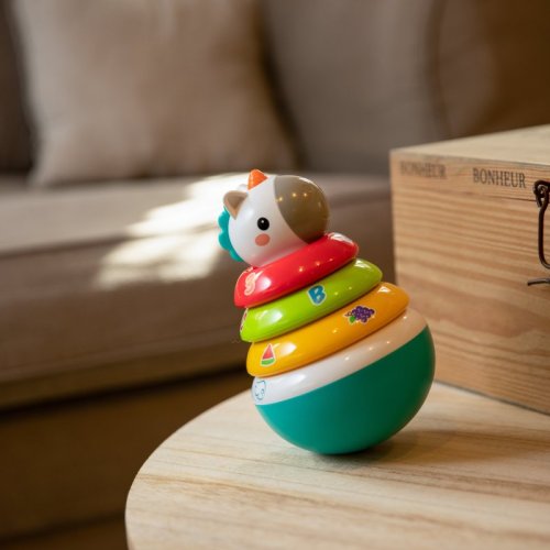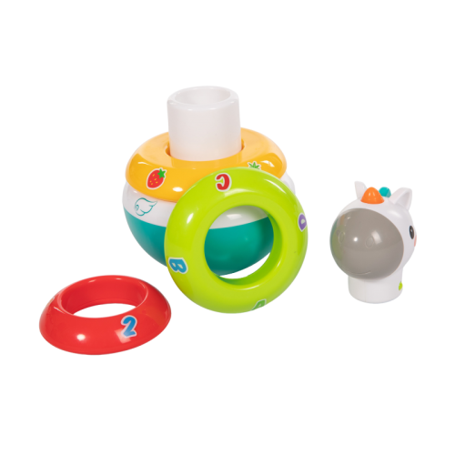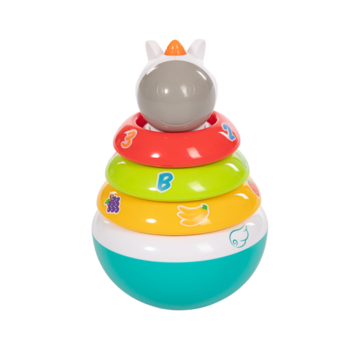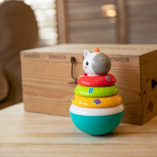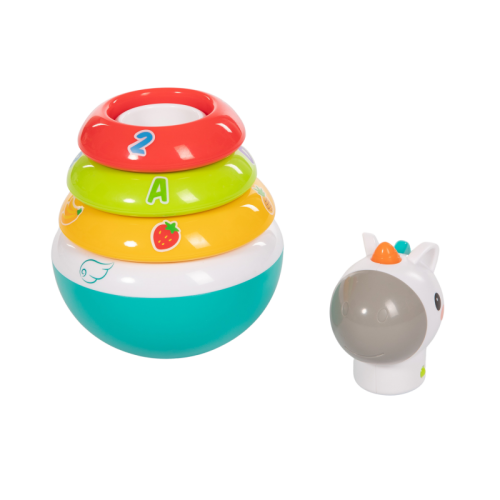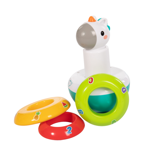 • hračka je tvorená kývajúcou sa základňou s kolíkom, 3 hrkajúcimi, farebnými krúžkami a hlavičkou Unicorna