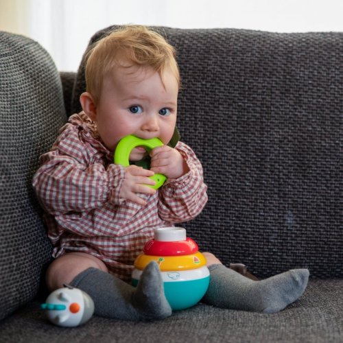 Táto úžasná plastová hračka rozvíja hmat a koordináciu oko-ruka.