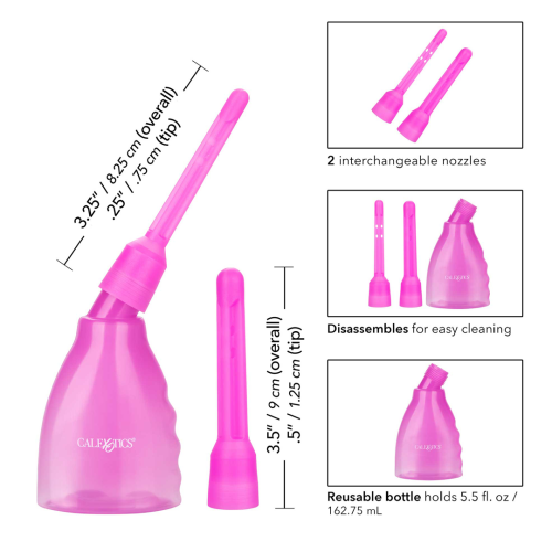 Sada na očistu análiku aj vagíny s dvoma nástavcami. Nástavce majú otvory v špičke aj na bokoch pre dokonalejšiu očistu. Dĺžka použiteľnej časti nástavcov 8,5 cm, šírka 1 cm a 1,5 cm. Objem nádobky 160 ml.