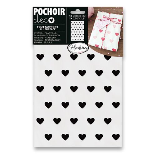 Plastová šablóna AladinE na blistri je určená na dekoráciu textilných i papierových projektov s motívom srdiečok. Vzor sa tupuje na textílii klasickou hustou textilnou farbou alebo sa dekoruje na papier pomocou aplikátora a rýchloschnúcich atramentov alebo atramentov v spreji. Po použití šablónu ihneď dobre umyte vlažnou vodou a osušte.