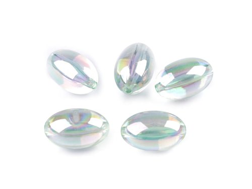 Plastové korálky v tvare olivy nadchnú deti aj dospelých. Sú doslova magické, pretože sú transparentné, ale povrch má vysoký lesk s AB efektom. Korálky môžete použiť na výrobu náhrdelníkov, príveskov ku kľúčom, hodia sa aj na ozdobenie tašiek a pod. Ich veľkou výhodou je nízka hmotnosť. Balenie 10 g obsahuje 5 ks korálikov.