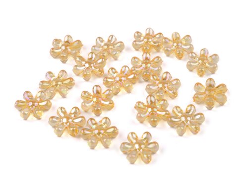 Plastové korálky v tvare kvetu nadchnú deti aj dospelých. Sú doslova magické, pretože sú transparentné, ale ich povrch má vysoký lesk s AB efektom. Našim fotografom sa fotografie veľmi podarili, ale verte, že v skutočnosti sú korálky ešte zaujímavejšie. Korálky môžete použiť na výrobu náhrdelníkov, náramkov, príveskov ku kľúčom a pod. Prievlak je umiestnený cez celú korálku - od špičky lístka stredom do špičky protiľahlého lístka - po navlečení sa kvety radí naplocho vedľa seba. Balenie 10 g obsahuje cca 18 ks korálikov.
