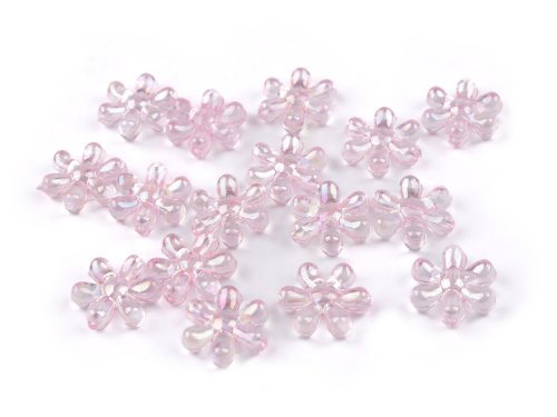 Plastové korálky v tvare kvetu nadchnú deti aj dospelých. Sú doslova magické, pretože sú transparentné, ale ich povrch má vysoký lesk s AB efektom. Našim fotografom sa fotografie veľmi podarili, ale verte, že v skutočnosti sú korálky ešte zaujímavejšie. Korálky môžete použiť na výrobu náhrdelníkov, náramkov, príveskov ku kľúčom a pod. Prievlak je umiestnený cez celú korálku - od špičky lístka stredom do špičky protiľahlého lístka - po navlečení sa kvety radí naplocho vedľa seba. Balenie 10 g obsahuje cca 18 ks korálikov.