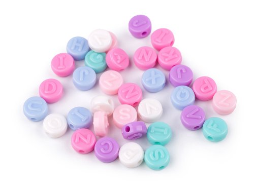 Korálky s písmenkami potešia predovšetkým školské deti. Môžu vyrábať populárne náramky priateľstva s menom obdarovaného. Korálky majú tvar okrúhle placky. Horizontálne umiestnený prievlak umožňuje skladať z písmen slova, mena a pod. Ako návlekový materiál môžete použiť gumy a silóny. V sáčku je mix rôznych písmen rôznych farieb. Vrecko nemusí obsahovať všetky kombinácie písmen z abecedy, jednotlivé balenia sa od seba môžu líšiť. Písmenká sú z anglickej abecedy, teda bez diakritických znamienok. V balení 10 g je 35 ks korálikov.