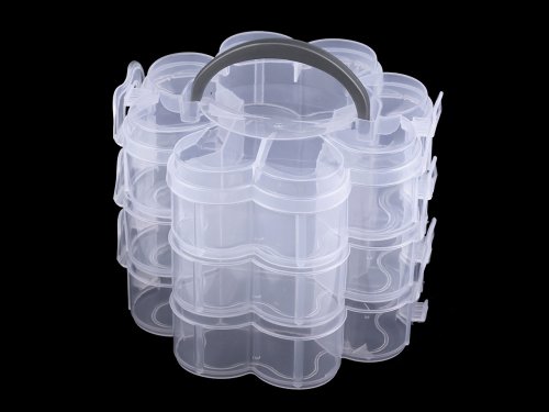 Zásobník v tvare štvorlístka má 3 poschodia. Každý zásobník je veko toho spodného, spájajú sa sponou na boku zásobníka. Vrchné poschodie má odnímateľné veko, ktoré sa tiež zatvára na sponu. Vďaka bočným sponám sa dajú k zásobníku pridávať neobmedzene ďalšie poschodia. Poradie poschodí môžete meniť, vďaka transparentnému plastu je dobre vidieť dovnútra. Priehradky sú určené skôr pre malý materiál, sú pevné, nedajú sa regulovať. Ich orientačná veľkosť je 4 x 9 x 3,5 cm. Na hornom poschodí je jedna priehradka dlhá cca 13 cm. Na jednom poschodí je 5 priehradok, v hornom 3. Vo veku je ucho na pohodlné prenášanie.