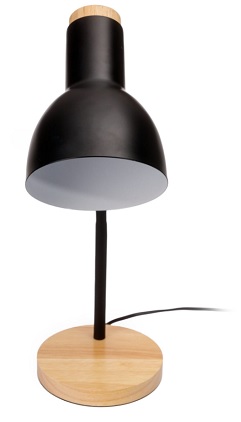 Elegantná stolná lampa s kovovým telom a drevenou základňou, flexibilnou hlavou a možnosťou použitia žiarovky podľa vlastného výberu.