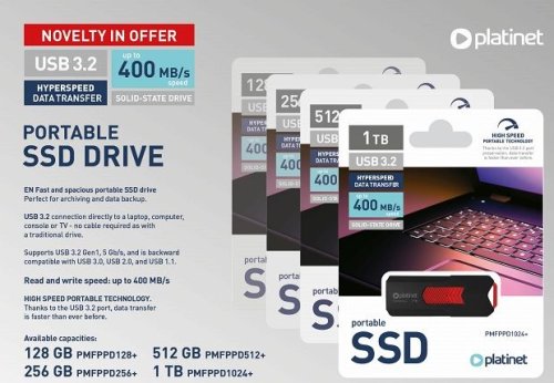 Prenosný USB disk Platinet SSD Drive 128 GB poskytuje rýchly a stabilný prenos dát vďaka technológii USB 3.2 Gen 2. Je to ideálne riešenie na prenos a ukladanie veľkých súborov, ako sú filmy, fotografie alebo dokumenty.