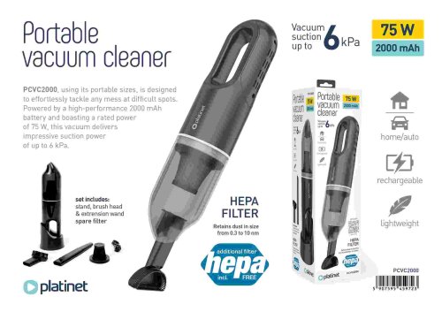 "PCVC2000 - poteší sacím výkonom až 6kPa a vysaje tak prach z ťažko prístupných miest. Batéria 2000mAh zaistí približne 10-20 minút vysávania, podľa použitého výkonu. Disponuje HEPA filtrom pre sviežu čistotu, kapacitou nádoby na prach 100ml, praktickým stojanom a praktickým stojanom s dlhou tryskou.