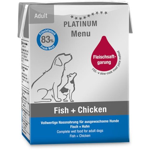Paštéta Platinum Menu Adult Fish + Chicken obsahuje 83% čerstvého kuracieho a rybieho mäsa z tuniaka a sardiniek. Vďaka jedinečnej metóde prípravy Fleischsaftgarung si mäso uchová plnú chuť, vôňu a všetky dôležité živiny. Prísady sa pomaly varia za nízkych teplôt uzavreté v obale Tetra Recart. Všetka šťava tak zostane vo vnútri, vrátane vitamínov a minerálov. Receptúra s vyváženým zložením vyhovuje aj psom s citlivým zažívaním. Hlavné prednosti:
