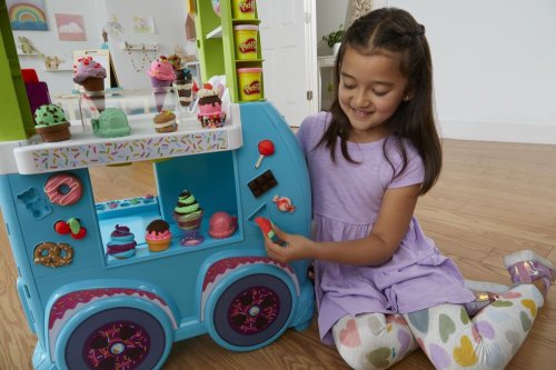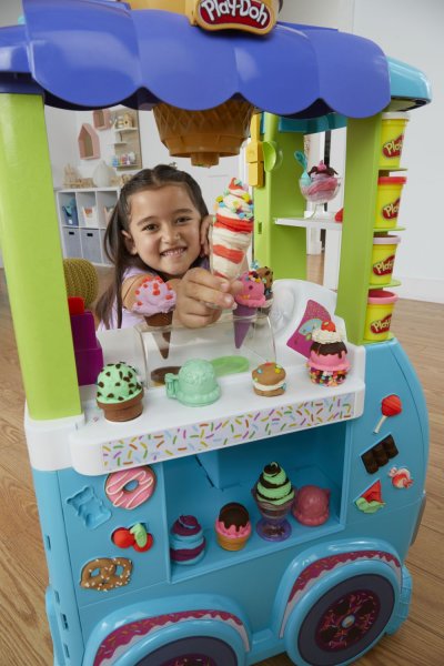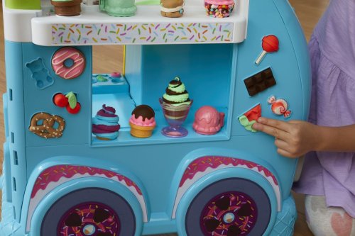 Zmrzlinááa! Je tu zmrzlinááá! Vaše deti sa s týmto Play-Doh zmrzlinárskym vozíkom v životnej veľkosti vžijú do role kreatívnych zmrzlinárov! Výroba a zdobenie všetkých týchto zmrzlinových Play-Doh pochúťok (vrátane točenej zmrzky v obrovskom kornúte) pôjde vďaka viac ako 25 rôznym doplnkom pekne od ruky a zákazníci vám môžu ihneď zaplatiť vďaka vstavanej pokladni. Svoje najlepšie výtvory si neváhajte vystaviť. Peknú atmosféru vyvolá klasická melódia zmrzlinárskeho vozíka a ďalšie zábavné zvukové efekty. Súčasťou vozíka sú poličky a úložný priestor, kde je možné odložiť všetky nástroje a prebytočné vybavenie, a modelínu môžete pohodlne zmiesť do žliabku na ďalšie použitie. Zmrzlinááa!