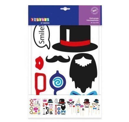 Vytvorte si masku z 30 rôznych motívov (okuliare, fúzy, kravata, motýlik, pohár, klobúk, korunka, úsmev, ...), ktoré môžete držať pred tvárou alebo nad hlavou. Ľahko sa skladajú. Ideálne pre večierky a oslavy. Obsah: 30 ks doplnkov, 30 špajlí, 30 držiakov