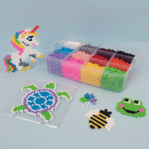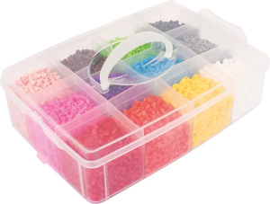 Praktická sada zažehľovacích korálikov a korálikov s písmenami uložená v plastovom organizéri.