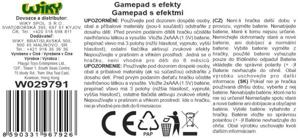 Gamepad s efektmi. Rozmery 14,5x5,5x10,5 cm. Zvukové efekty. 2xAAA batérie súčasťou. Prepínač vľavo nižšia hlasitosť, uprostred vypnuté, vpravo vyššia hlasitosť. Joystick a 4 tlačidlá so zvukovými efektmi, cvakajúce otočné koliesko