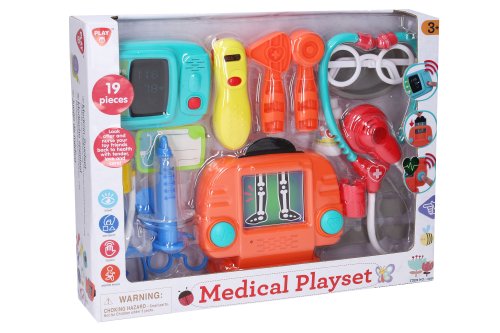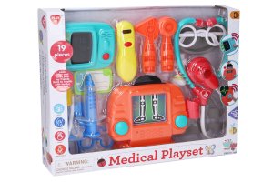 Playgo Lekárska sada. Obsahuje 19ks: fonendoskop, náplasti, kladivko, nožnice, tlakomer, teplomer, okuliare, injekciu a ďalšie. 5xAAA batérie súčasťou. svetelné a zvukové efekty.