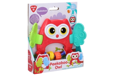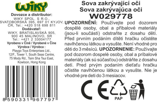 Sova zakrývajúca oči. Rozmery 18x2,5x11,5 cm. Pohybujúce cvakajúce krídla, otáčajúce oči, 2 krúžky.