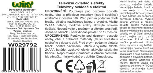 Televízny ovládač s efektmi. Rozmery 5,5x3,5x14,5 cm. Zvukové efekty - zvuky, piesne, angličtina. 2xAAA batérie súčasťou.