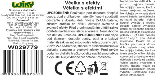 Včela s efektmi. Rozmery 14x4,5x16 cm. Svetelné a zvukové efekty stlačením srdiečka na brušku. 2xAAA batérie súčasťou. Dva krúžky na pohyblivom škrípajúcom krídle, hryzátko na druhom krídle.
