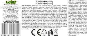 Playgo xylofón dotykový. Rozmery 31x13,5x5,5 cm. Súčasťou je prútik spojený s xylofónom povrázkom. Svetelné a zvukové efekty. 3 tlačidlá - obrázok xylofónu - jednotlivé tóny kláves, obrázok noty - melódie, obrázok magickej paličky - výučba, úlohou je stlačiť v danom okamihu rozsvietenú klávesu. 3xAAA batérie súčasťou. Prepínač OFF/nízka hlasitosť/vysoká hlasitosť.