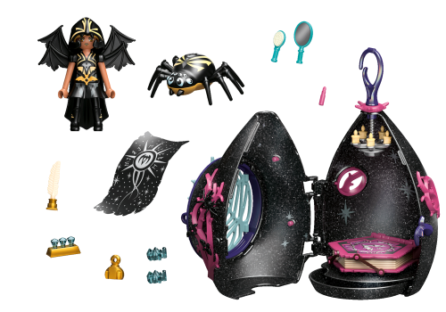 Dobrodružstvo v Ayume pokračujú! Úkryt ponúka strašidelný a útulný domov. Tu si víla schováva ukradnuté kryštály. Kryštály sú starostlivo ukryté v knihe. Pomocou háčika je možné úkryt Netopierie víly zavesiť v detskej izbe alebo na PLAYMOBIL® 70807 Zrúcaninu Netopierích víl (predávané samostatne). Navyše ho možno ozdobiť trblietavými hviezdičkami. Potom sa pohodlne usadí a študuje kúzelný pergamen. Kde by sa mohlo skrývať viacero kryštálov? A keď je čas ísť spať, netopieria víla sa zavesí na luster hlavou dole a zaspáva. Zatiaľ čo jej pavúk stráži vonku pri pavučinových dverách. S takou hliadkou sa nikto neodváži kryštály ukradnúť.