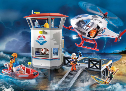 pobrežná stráž so záchranným vrtuľníkom a člnom.