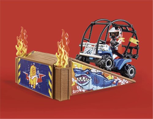 Perfektný začiatok do herného sveta PLAYMOBIL! Užite si vzrušenie a zábavu na Stunt Show! Sledujte, ako odvážny kaskadér riadi štvorkolku z ohnivej rampy, prevaľuje sa vo vzduchu a bezpečne pristáva späť na zem.