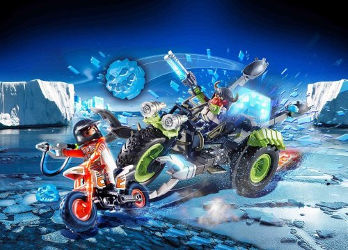 Ľadová trojkolka arktických rebelov prenasleduje tajného agenta na motorke. Z katapultu naň pália ľadové gule. Ľadový portál so zvukovými a svetelnými efektmi. Prevádzku efektov zabezpečujú 2 x 1,5 V AAA batérie (nie sú súčasťou balenia). Balenie obsahuje: 2 figúrky, trojkolku, motorku a mnoho ďalších doplnkov. Vhodné pre deti od 6 rokov. Téma: PLAYMOBIL® Top Agents