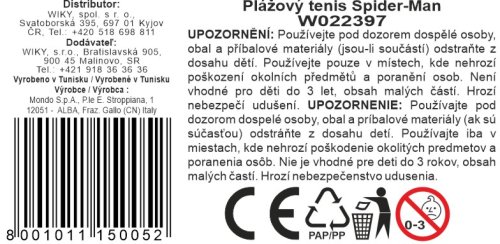 Je sada dvoch rakiet a jednej loptičky na plážový tenis. Jedná sa o typizované beachtenisové rakety, ktoré sú vhodné pre začiatočníkov a veľmi obľúbené pre školy. Rakety sa výborne držia v ruke a preto budete môcť bleskovo reagovať na útok od protihráča. Plážový tenis je u nás pomerne mladý šport, výborne ale zabaví vaše deti doma na ihrisku alebo na dovolenke. Motív obrázkov SPIDERMAN dodávaný podľa aktuálnych skladových zásob.