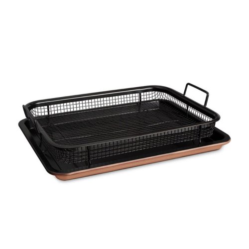 Táto sada pečiacej tácky s kovovým košom je vyrobená z uhlíkovej ocele s titánovou nepriľnavou vrstvou, ktorá zaisťuje vysokú kvalitu a odolnosť. Súprava obsahuje kovový kôš z nerezovej ocele. Veľkosť tácky je 32,5x24,5x2 cm a veľkosť košíka je 30x20,5x3,5 cm. Metalická ružová zlatá farba a elegantný dizajn dodávajú tejto sade moderný vzhľad, ktorý sa hodí do každej kuchyne.