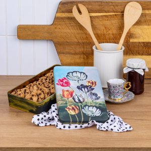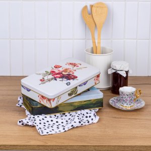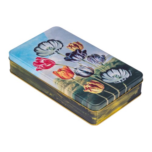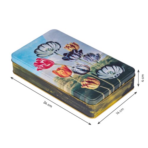 Štýlová plechová dóza s vyobrazením tulipánov má všestranné praktické využitie. Môžete do nej uložiť sladkosti, pečivo či iné potraviny, najrôznejšie poklady a ďalšie domáce drobnosti. Dóza je vyrobená zo 100% ocele s cínovou vrstvou.
