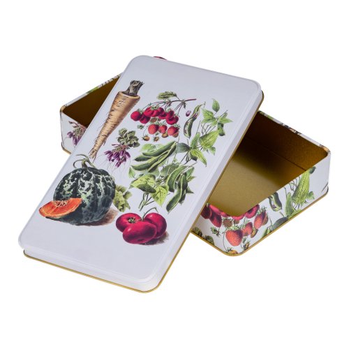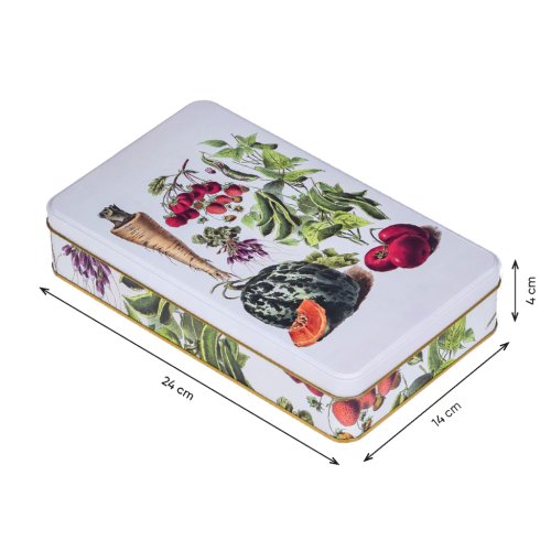 Štýlová plechová dóza s vyobrazením ovocia a zeleniny má všestranné praktické využitie. Môžete do nej uložiť sladkosti, pečivo či iné potraviny, najrôznejšie poklady a ďalšie domáce drobnosti. Dóza je vyrobená zo 100% ocele s cínovou vrstvou.