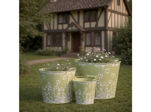 Tento set plechových kvetináčov v zelenej farbe obsahuje tri oválne kvetináče rôznych veľkostí, ideálny na pestovanie rastlín a kvetov. Ich rozmery sú 160x140x245mm, 140x135x220mm, 120x120x205mm.