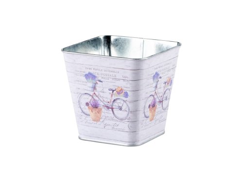 Hranatý plechový kvetináč s motívom bicykla, ideálny pre moderný štýl záhrady. Jeho rozmery sú 125x125x120mm.