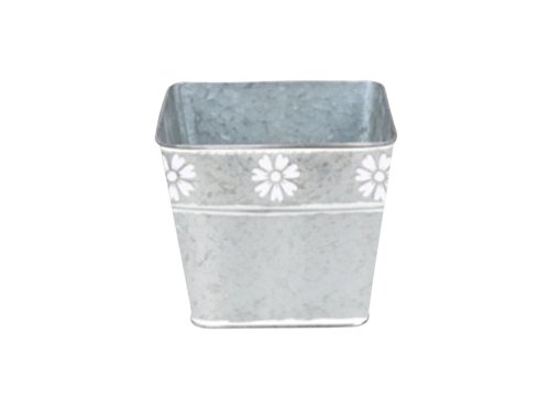 Hranatý plechový kvetináč s kvetinovým vzorom v šedej a bielej farbe, perfektný na dekoráciu. Jeho rozmery sú 125x125x120mm.