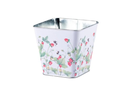 Hranatý plechový kvetináč s motívom jahôd, ideálny pre letnú atmosféru. Jeho rozmery sú 125x125x120mm.