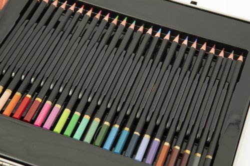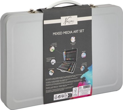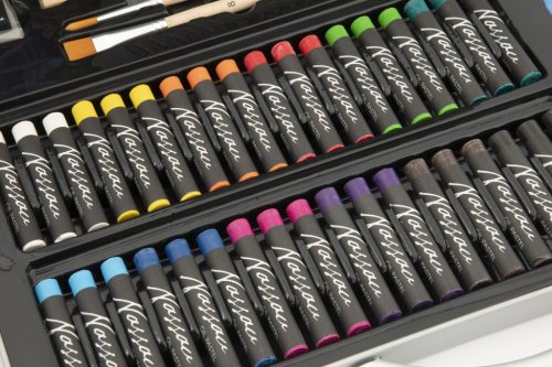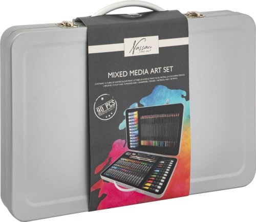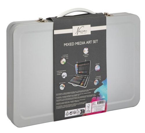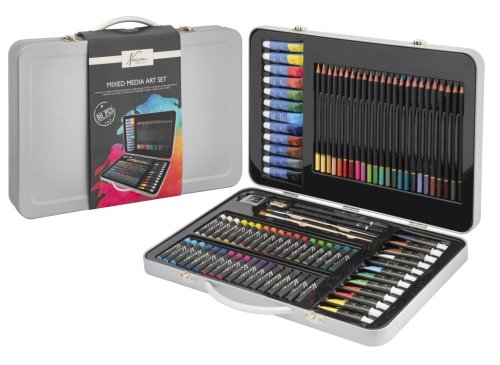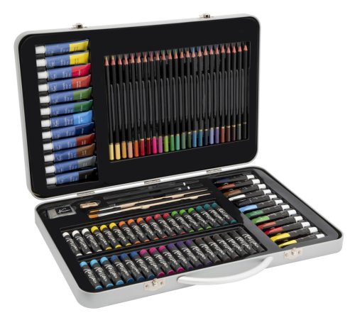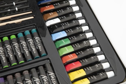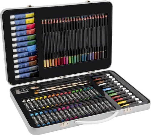 12 akvarelových farieb 12 ml, 12 akrylových farieb 12 ml, 24 pasteliek, 2 štetce, 36 olejových pastelov, 2 skicovacie ceruzky, strúhadlo, gumu.