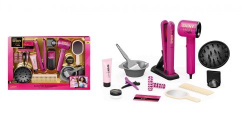 Veľká kadernícka súprava obsahuje 16 ks. Fén je na batérie. Hrebeň, nožnice, žehlička na vlasy, sadu na farbenie vlasov.