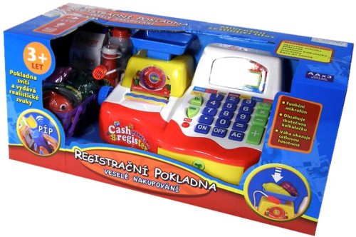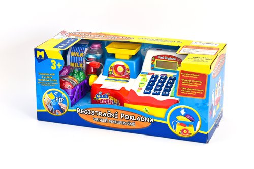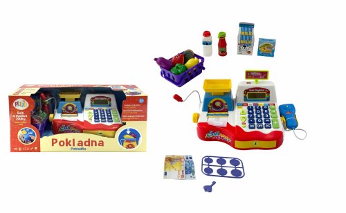 Doplnky pre reálny zážitok: K pokladni patrí aj sada detských peňazí (bankovky a mince), nákupný košíček a imitácia potravín (nákup), takže sa deti môžu ihneď začať hrať na obchod.