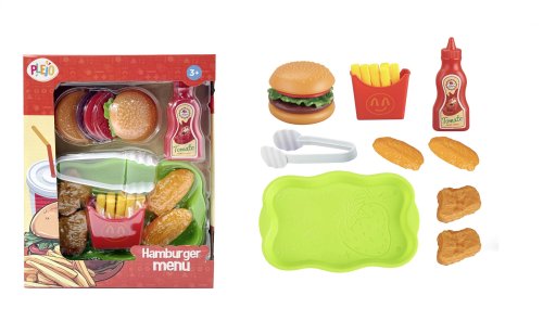V sade nájdete všetko, čo potrebujete na prípravu chutného hamburgera, a často k nemu aj ďalšie dobroty, ako sú napríklad chrumkavé hranolky, kečup a výborné kúsky kurčaťa. Vďaka tomu sa deti môžu skvele hrať na predávaní, nakupovaní alebo varení.