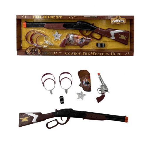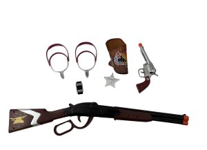 Sada obsahuje veľkú pušku so zvukmi, kolt s puzdrom, ostrohy ako pre skutočného kovboja a šerifov odznak.