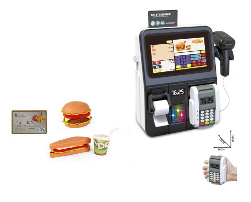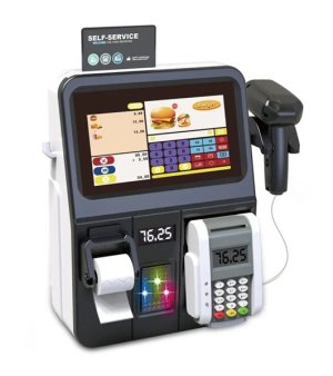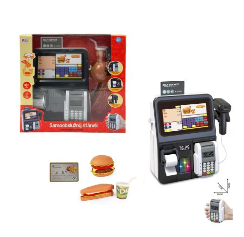 Platobný terminál: Keď si zákazník vyberie, príde na rad terminál. Môžeš sa hrať, že platí kartou alebo napríklad mobilom! Jednoducho priloží a píp! - peniažky sú "zaplatené" a môže si odniesť svoju objednávku.