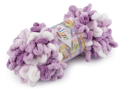 Priadza Alize Puffy color je mäkká, chlpatá ženilková priadza s veľkými očkami. Tvoria nádherné farebné prechody. Na pletenie nepotrebujete ihlice ani háčik - prepletajú sa jednotlivé očká. Je vhodná na pletenie diek, šálov a pod. Približná spotreba na deku s rozmermi 100 x 100 cm je cca 5 klbko.