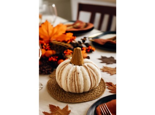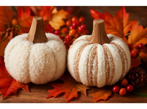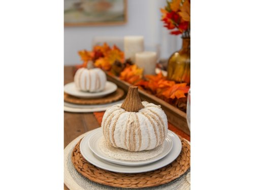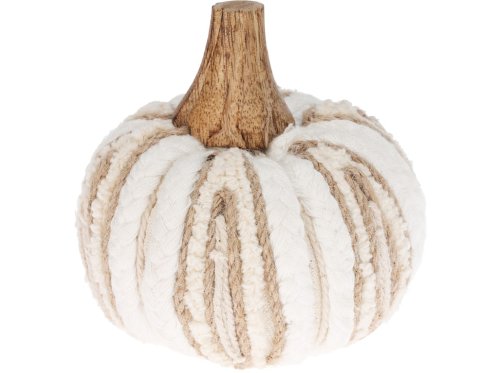 Ručný vzhľad, hebká bavlna, tlmené tóny bielej a hnedej – tieto pletené tekvice sú štýlovou alternatívou ku klasickej keramike. Skvele vyzerajú v duete aj v skupine s prírodnými materiálmi.
