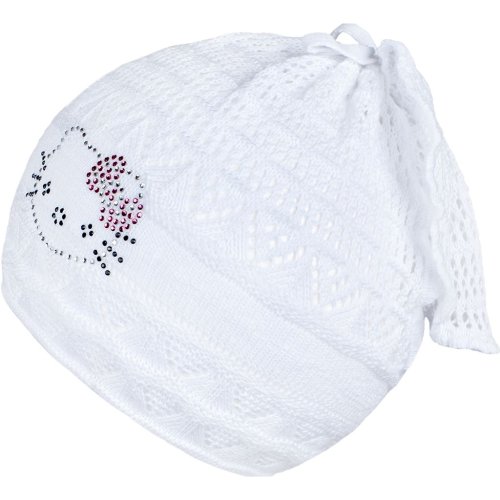 Jarná pletená čiapočka-šatka New Baby. Čiapočku zdobí obrázok mačičky s trblietavými kamienkami. Zloženie: 100% bavlna. Materiál je pružný. Obvod okolo hlavičky cca 40-50 cm.