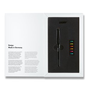 PLNIACE PERO:, * ergonomicky upravená úchopová zóna, * odpružený kovový klip v čiernej farbe, * nasadzovacie viečko, * súprava obsahuje pero LAMY safari a šesť farebných krúžkov, * možnosť použitia ako atramentových bombičiek, tak aj plnenie pera atramentom z fľaštičky, Dodáva.