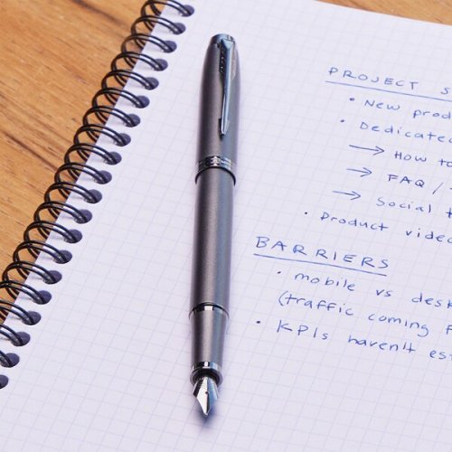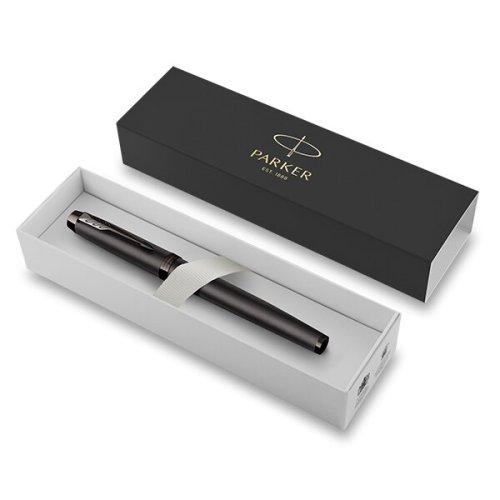 Plniace pero:, * nasadzovacie viečko, * hrot z nerezovej ocele zdobený jemnou rytinou, potiahnutý lesklo titánovou vrstvou, * prispôsobené výhradne na používanie atramentových bombičiek Quink alebo konvertora (nie je súčasťou balenia), Dodávané s modrou bombičkou, v elegantnom darčekovom balení. technológiu PVD. Vďaka módnemu monochromatickému prevedeniu a modernému matnému dizajnu je Parker IM Monochrome ideálnym doplnkom pre mladú generáciu. Je elegantný aj vysoko profesionálny a spoľahlivý., AKO SA LÍŠIA HROTY FAM?, F - Slabý hrot (Fine) - Vhodný pre bežné písanie a poznámky. Mierny tlak vytvára jemnú linku. Veľmi obľúbený, vhodný pre užívateľov so štandardným rukopisom., M - Stredný hrot (Medium) - Priemerný tlak a šírka linky. Vhodný pre užívateľov, ktorí majú radi maličko silnejšiu linku.,