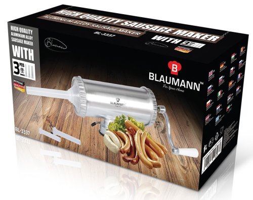 plnička klobás a jaterníc pre domáce použitie - vyrobená z pevnej hliníkovej zliatiny - ručnú plničku možno využiť na plnenie klobás, salámov, párkov, jaterníc a ďalších pokrmov - použijete ju aj pri výrobe cukroví - kapacita je 1,5 kg mäsa - ľahké a rýchle čistenie - súčasťou balenia sú tri nástavce: 15, 19 a 22 mm- značka: Blaumann.