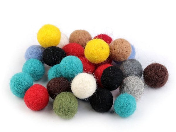 Farebný mix plstených guličiek z pravého ovčieho rúna. Výhodou týchto guličiek je ľahký a príjemný prírodný materiál a výrazné farby. [Vnútri sú spevnené malou polystyrénovou guličkou.] Použitie: Bambulky sú vhodné na výrobu náhrdelníkov, náušníc, náramkov alebo príveskov na kľúče a mobil. Môžete si s nimi aj originálne ozdobiť čiapky, šály, svetre alebo kabelky.