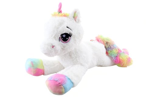 Plyšový ležiaci jednorožec - biely s dúhovými doplnkami. Rozmery cca 80x45x23 cm. Vek 0+